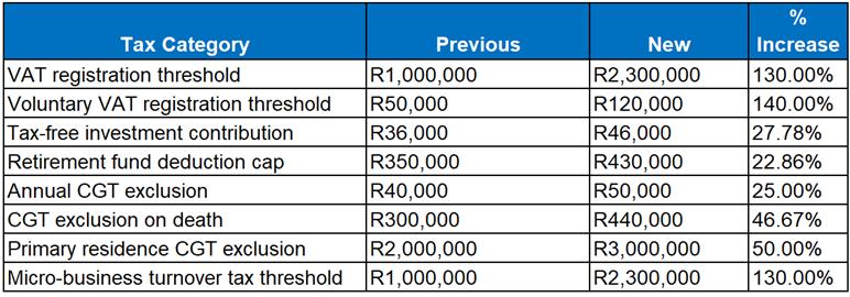 - The annual Tax-Free Savings Account contribution limit rises to R46,000.