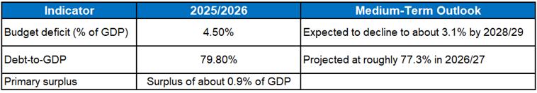 From a tax perspective, the budget is moderately expansionary for households but neutral for corporates. Inflation adjustments to personal tax brackets and credits provide relief without reducing revenue in real terms, while the decision not to raise VAT or corporate taxes supports investor confidence. The withdrawal of previously proposed tax hikes further reinforces a pro-growth tone.